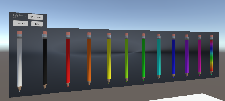 Pen set includes buttons to hide all pens in case users do not want their view cluttered and a global reset button in case pens get lost or hidden. If you wish to hide the dark metallic back-plate, simply toggle off the 'panel' inside the 'frame' object after dropping the prefab into your scene. Buttons can be moved by moving the 'frame' object as desired.
